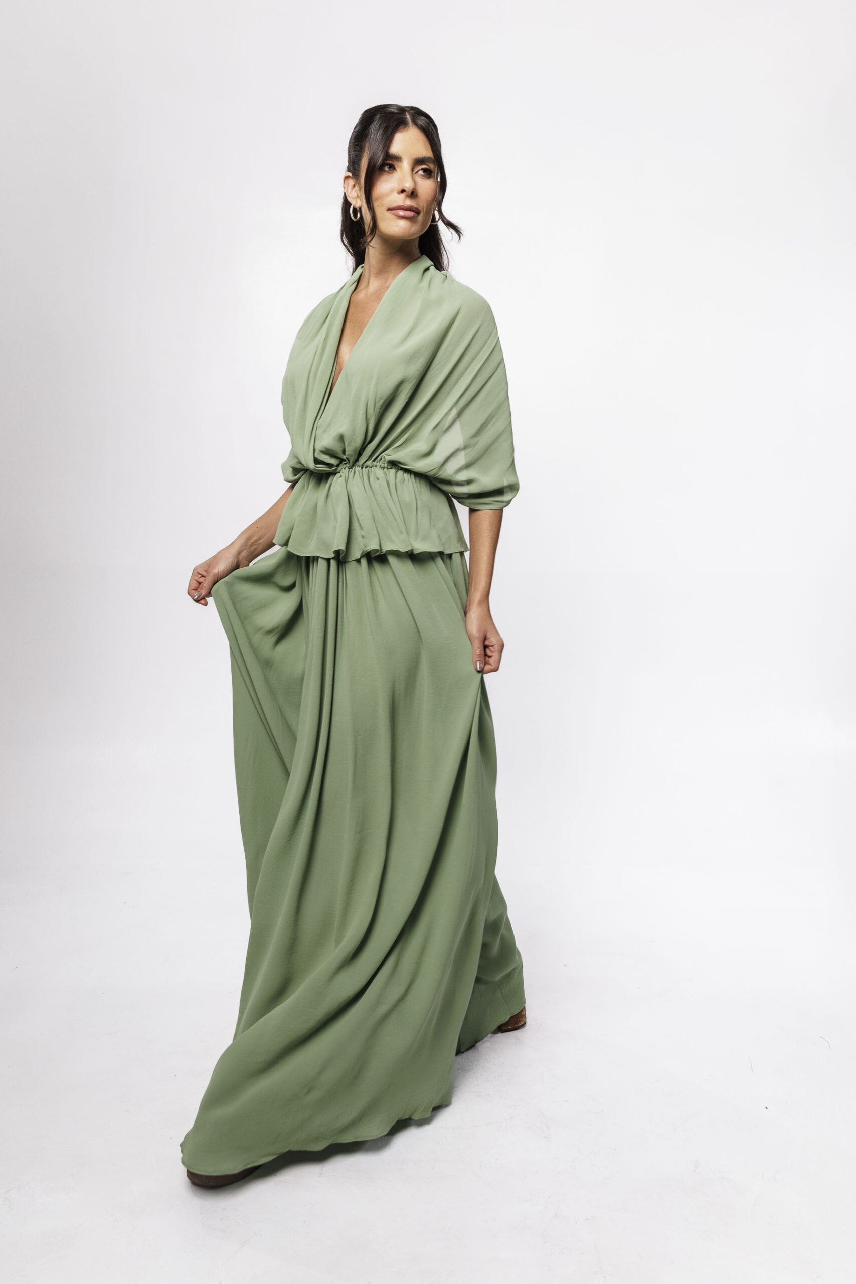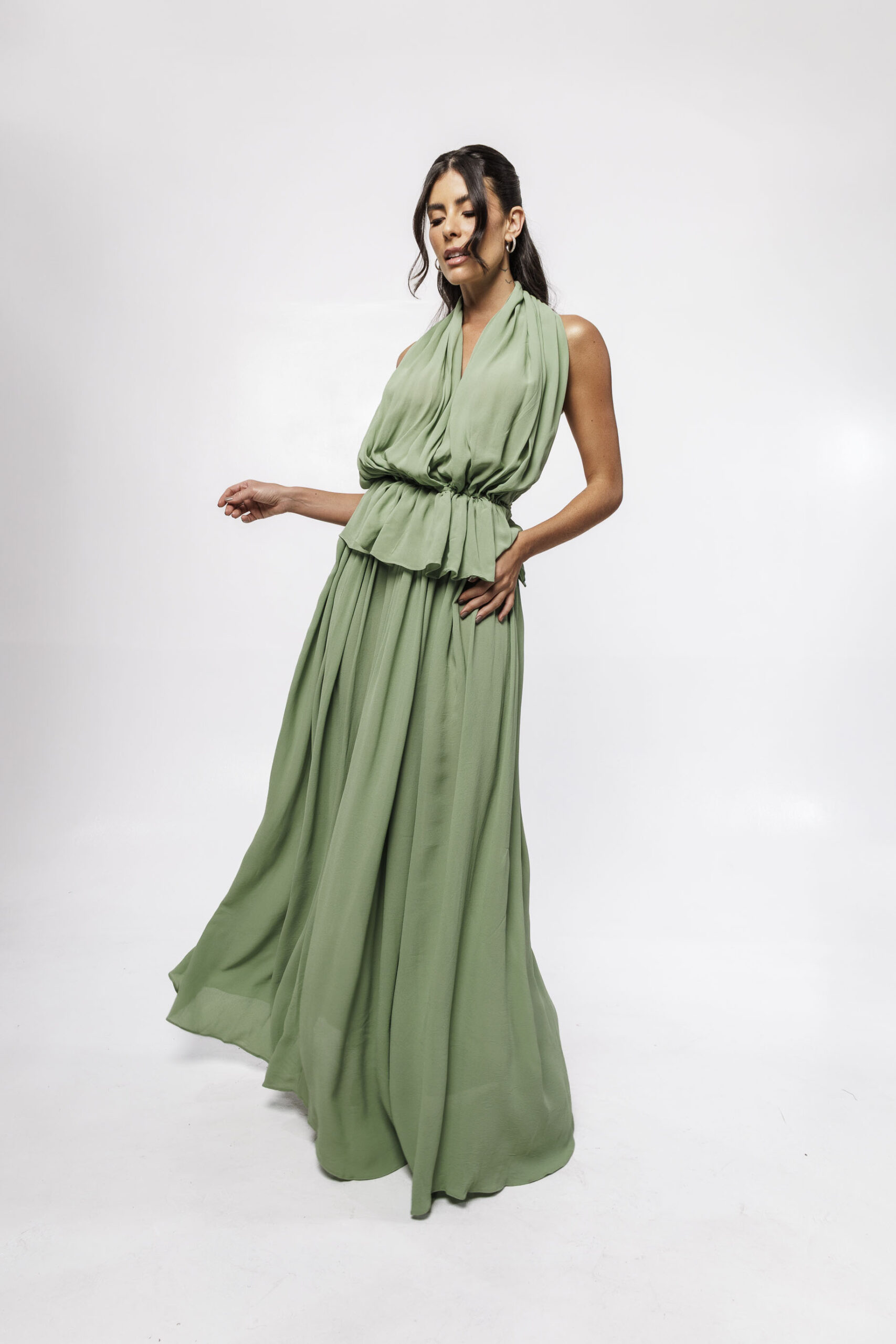 Saia confeccionada em 100% viscose, com comprimento longo. O cós em elástico apresenta drapeado, proporcionando melhor ajuste e detalhe de acabamento. Acompanha forro removível em 100% viscose.